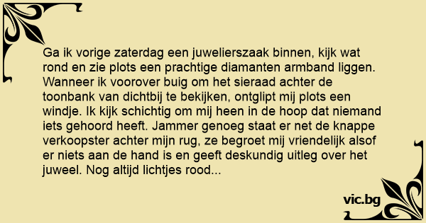 Ga ik vorige zaterdag een juwelierszaak binnen, kijk wat rond en zie plots een prachtige diamanten armband liggen. Wanneer ik voorover buig om het sieraad achter de toonbank van dichtbij te bekijken, ontglipt mij plots een windje. Ik kijk schichtig om mij heen in de hoop dat niemand iets gehoord heeft. Jammer genoeg staat er net de knappe verkoopster achter mijn rug, ze begroet mij vriendelijk alsof er niets aan de hand is en geeft deskundig uitleg over het juweel. Nog altijd lichtjes rood aangelopen en in verlegenheid, vraag ik de dame hoeveel deze armband kost. Antwoordt de verkoopster: