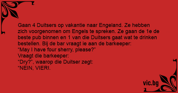 1945, twee duitsers worden boven engeland gedropt. Ze besluiten om een gezellige pub te bezoeken. Eenmaal binnen, vraagt de barman om hun bestelling "Two whiskey." Barman: "Dry whiskey?" "NEIN ZWEI!"
