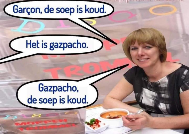 - Garçon, de soep is koud. - Het is gazpacho. - Gazpacho, de soep is koud.