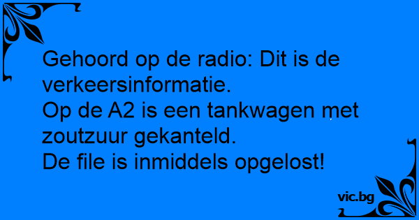 Gehoord op de radio: Dit is de verkeersinformatie.<br />Op de A2 is een tankwagen met zoutzuur gekanteld.<br />De file is inmiddels opgelost!