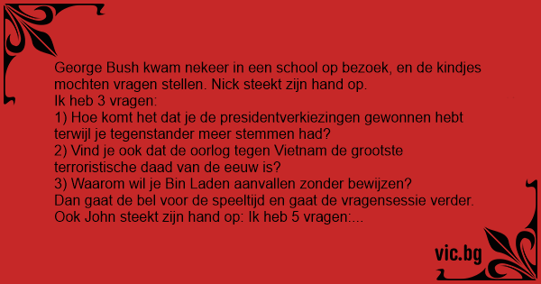George Bush was benieuwd of hij nog een beetje poplair was onder de amerikaanse jeugd en bezocht een school. Hij hield een korte toespraak en vroeg de kinderen of ze misschien vragen aan hem wilden...