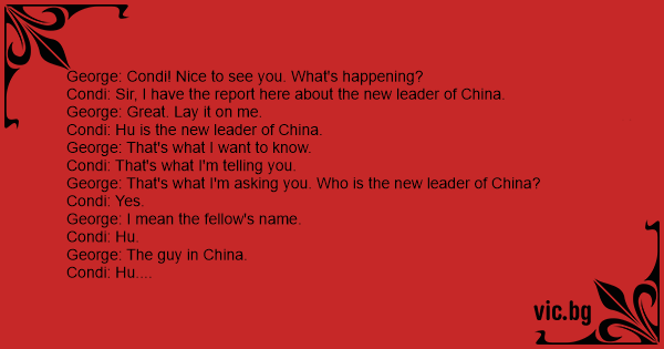 George: Look, Condi. I need to know the name of the new leader of China. Get me the Secretary General of the U. N. on the phone.