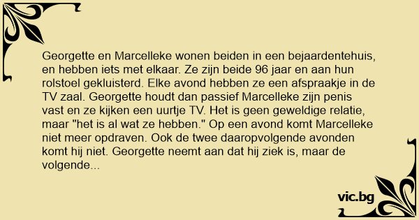 Un mos la azil ii povesteste unei colege ca raposata sotie ii tinea pu*a in maini la culcare si numai asa putea sa adoarma. Batrana miloasa ii ajuta deci si ea sa poata dormi mosul. Si intr-adevar...