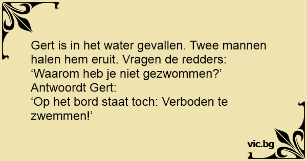 Gert is in het water gevallen. Twee mannen halen hem eruit. Vragen de redders: