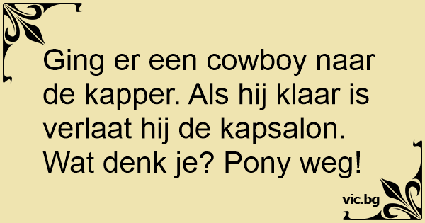 Ging er een cowboy naar de kapper. Als hij klaar is verlaat hij de kapsalon. Wat denk je? Pony weg!
