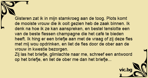 Gisteren zat ik in mijn stamkroeg aan de toog. Plots komt de mooiste vrouw die ik ooit gezien heb de zaak binnen. Ik denk na hое ik ze kan aanspreken, en bestel tenslotte een van de beste flessen champagne die het café te bieden heeft. Ik hing er een briefje aan met de vraag of zij deze fles met mij wou opdrinken, en liet de fles door de ober aan de vrouw in kwestie bezorgen.