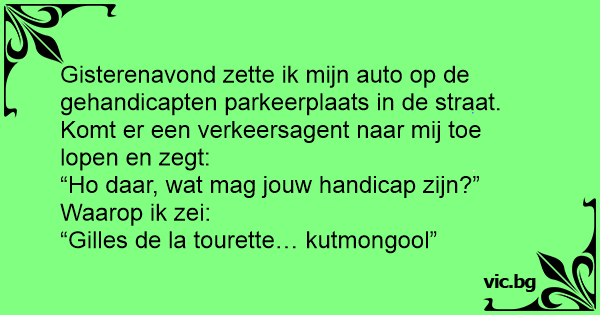 Gisterenavond zette ik mijn auto op de gehandicapten parkeerplaats in de straat. Komt er een verkeersagent naar mij toe lopen en zegt: