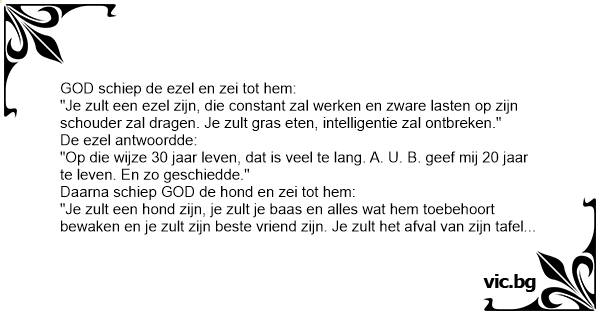 Gud skapade åsnan och sade: - Du skall vara åsna och arbeta från soluppgång till solnedgång, bära stora lass och vara ointelligent. Du skall leva i 60 år. Åsnan sade: - Herre, att leva i 60 år...