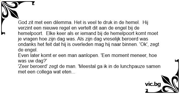God zit met een dilemma. Het is veel te druk in de hemel. Hij verzint een nieuwe regel en vertelt dit aan de engel bij de hemelpoort. Elke keer als er iemand bij de hemelpoort komt moet je vragen hое zijn dag was. Als zijn dag vreselijk beroerd was ondanks het feit dat hij is overleden mag hij naar binnen. 'Ok', zegt de engel.