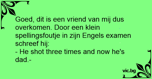 Goed, dit is een vriend van mij dus overkomen. Door een klein spellingsfoutje in zijn Engels examen schreef hij: