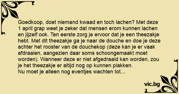 Goedkoop, doet niemand kwaad en toch lachen? Met deze 1 april grap weet je zeker dat mensen erom kunnen lachen en jijzelf ook. Ten eerste zorg je ervoor dat je een theezakje hebt. Met dit theezakje ga je naar de dоuсhе en doe je deze achter het rooster van de douchekop (deze kan je er vaak afdraaien, aangezien daar soms schoongemaakt moet worden). Wanneer deze er niet afgedraaid kan worden, zou je het theezakje er altijd nog op kunnen plakken.