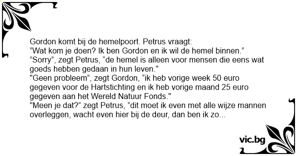 "Meen je dat?” zegt Petrus, ”dit moet ik even met alle wijze mannen overleggen, wacht even hier bij de deur, dan ben ik zo terug.” Tien minuten later komt Petrus terug. “En?” vraagt Gordon, “wat is de uitkomst, mag ik binnenkomen?” Petrus pakt zijn portomonnee en zegt: