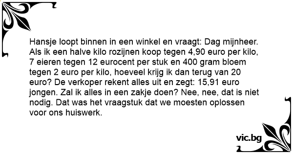Hansje loopt binnen in een winkel en vraagt: Dag mijnheer. Als ik een halve kilo rozijnen koop tegen 4,90 euro per kilo, 7 eieren tegen 12 eurocent per stuk en 400 gram bloem tegen 2 euro per kilo, hoeveel krijg ik dan terug van 20 euro? De verkoper rekent alles uit en zegt: 15,91 euro jongen. Zal ik alles in een zakje doen? Nee, nee, dat is niet nodig. Dat was het vraagstuk dat we moesten oplossen voor ons huiswerk.