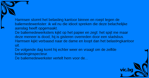 Harmsen stormt het belasting kantoor binnen en roept tegen de baliemedewerkster: ik wil nu die idiоот spreken die deze belachelijke aanslag heeft opgemaakt.