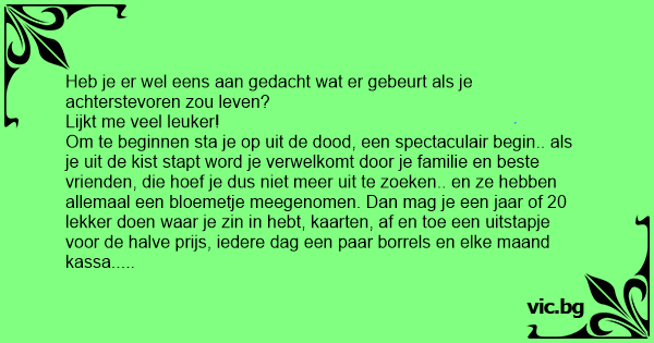 Om te beginnen sta je op uit de dood, een spectaculair begin.. als je uit de kist stapt word je verwelkomt door je familie en beste vrienden, die hoef je dus niet meer uit te zoeken.. en ze hebben allemaal een bloemetje meegenomen. Dan mag je een jaar of 20 lekker doen waar je zin in hebt, kaarten, af en toe een uitstapje voor de halve prijs, iedere dag een paar borrels en elke maand kassa.. pensioen!