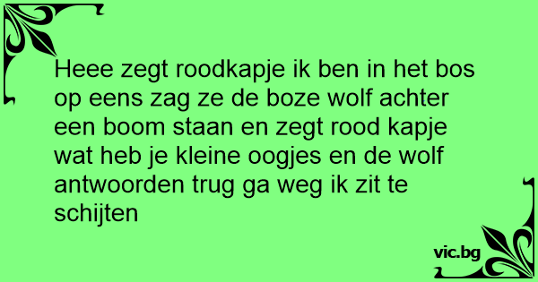 Heee zegt roodkapje ik ben in het bos op eens zag ze de boze wolf achter een boom staan en zegt rood kapje wat heb je kleine oogjes en de wolf antwoorden trug ga weg ik zit te schijten