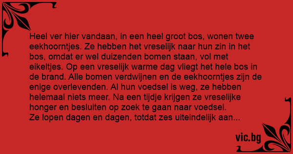 Heel ver hier vandaan, in een heel groot bos, wonen twee eekhoorntjes. Ze hebben het vreselijk naar hun zin in het bos, omdat er wel duizenden bomen staan, vol met eikeltjes. Op een vreselijk warme dag vliegt het hele bos in de brand. Alle bomen verdwijnen en de eekhoorntjes zijn de enige overlevenden. Al hun voedsel is weg, ze hebben helemaal niets meer. Na een tijdje krijgen ze vreselijke honger en besluiten op zoek te gaan naar voedsel.