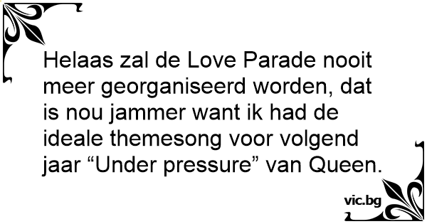 Helaas zal de Love Parade nooit meer georganiseerd worden, dat is nou jammer want ik had de ideale themesong voor volgend jaar “Under pressure” van Queen.