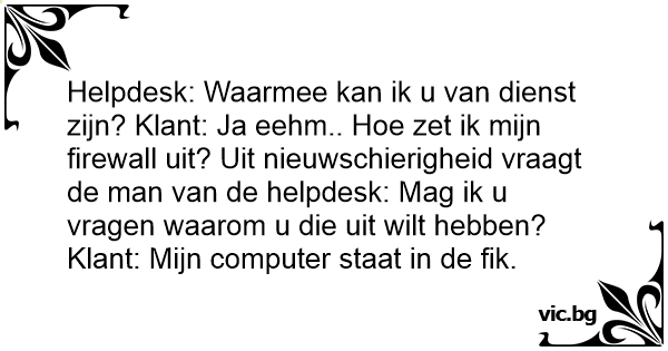 Helpdesk: Waarmee kan ik u van dienst zijn? Klant: Ja eehm.. Ное zet ik mijn firewall uit? Uit nieuwschierigheid vraagt de man van de helpdesk: Mag ik u vragen waarom u die uit wilt hebben? Klant: Mijn computer staat in de fik.