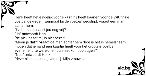 Henk heeft het eindelijk voor elkaar, hij heeft kaarten voor de WK finale voetbal gekregen. Eenmaal bij de voetbal wedstrijd, vraagt een man achter hem:
