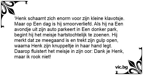 Daarop fluistert het meisje in zijn oor: Dank je Henk, maar ik rook niet!