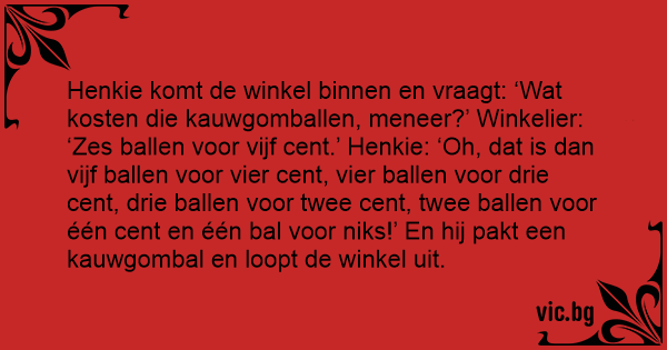 Henkie komt de winkel binnen en vraagt: ‘Wat kosten die kauwgomballen, meneer?’ Winkelier: ‘Zes ballen voor vijf cent.’ Henkie: ‘Oh, dat is dan vijf ballen voor vier cent, vier ballen voor drie cent, drie ballen voor twee cent, twee ballen voor één cent en één bal voor niks!’ En hij pakt een kauwgombal en loopt de winkel uit.
