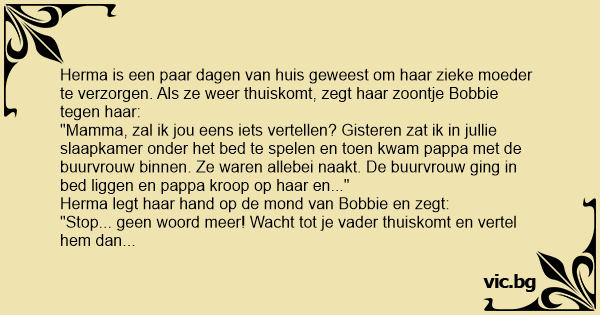 "Gisteren zat ik in jullie slaapkamer onder het bed te spelen en toen kwam pappa met de buurvrouw binnen. Ze waren allebei naakt. De buurvrouw ging in bed liggen en pappa kroop op haar en toen deden ze precies het zelfde wat mamma met oom Henk deed toen pappa vorige zomer op zakenreis was!"