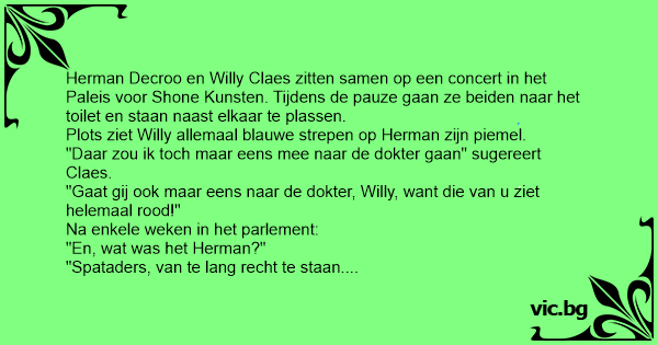 Herman Decroo en Willy Claes zitten samen op een concert in het Paleis voor Shone Kunsten. Tijdens de pauze gaan ze beiden naar het toilet en staan naast elkaar te plassen.