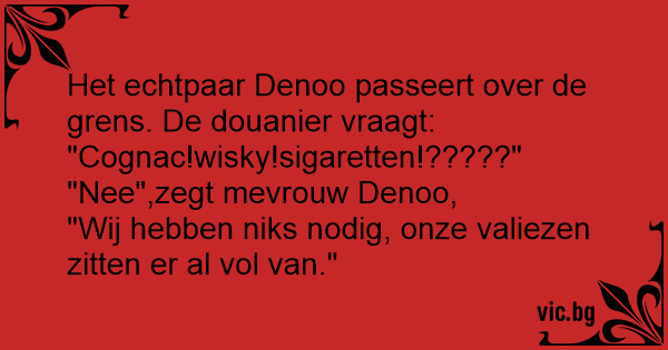 Het echtpaar Denoo passeert over de grens. De douanier vraagt: