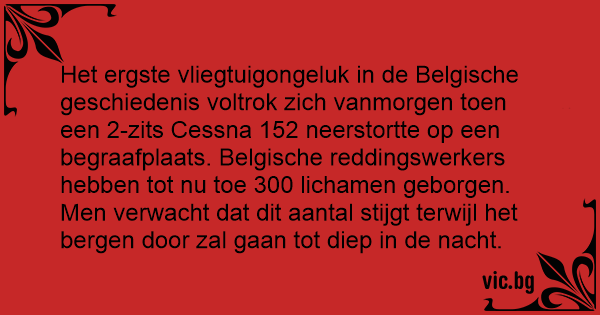 Het ergste vliegtuigongeluk in de Belgische geschiedenis voltrok zich vanmorgen toen een 2-zits Cessna 152 neerstortte op een begraafplaats. Belgische reddingswerkers hebben tot nu toe 300 lichamen geborgen. Men verwacht dat dit aantal stijgt terwijl het bergen door zal gaan tot diep in de nacht.