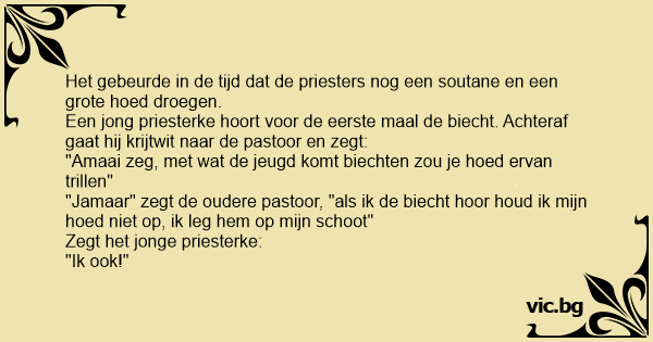 "Jamaar" zegt de oudere pastoor, "als ik de biecht hооr houd ik mijn hoed niet op, ik leg hem op mijn schoot"
