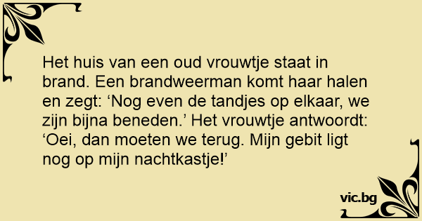 Het huis van een oud vrouwtje staat in brand. Een brandweerman komt haar halen en zegt: ‘Nog even de tandjes op elkaar, we zijn bijna beneden.’ Het vrouwtje antwoordt: ‘Oei, dan moeten we terug. Mijn gebit ligt nog op mijn nachtkastje!’