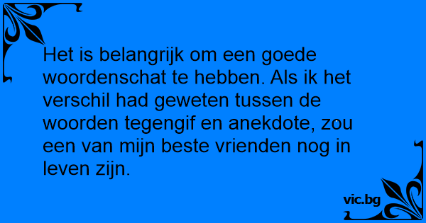 Het is belangrijk om een goede woordenschat te hebben. Als ik het verschil had geweten tussen de woorden tegengif en anekdote, zou een van mijn beste vrienden nog in leven zijn.