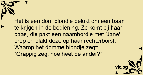 Het is een dom blondje gelukt om een baan te krijgen in de bediening. Ze komt bij haar baas, die pakt een naambordje met 'Jane' erop en plakt deze op haar rechterborst.