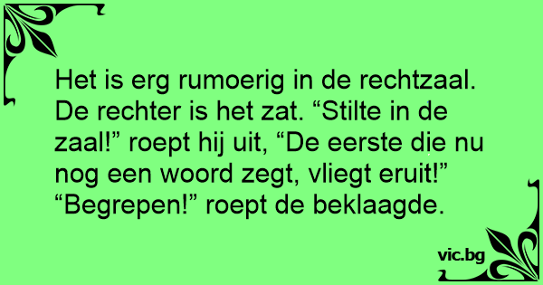 Het is erg rumoerig in de rechtzaal. De rechter is het zat. “Stilte in de zaal!” roept hij uit, “De eerste die nu nog een woord zegt, vliegt eruit!”