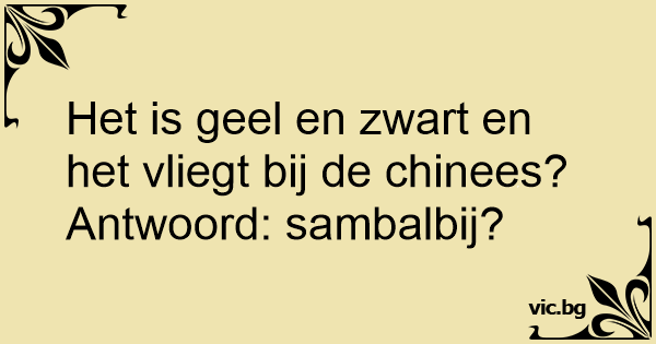 Het is geel en zwart en het vliegt bij de chinees?Antwoord: sambalbij? 0 0 0 Dieren moppen Chinezenmoppen