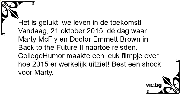 Het is gelukt, we leven in de toekomst! Vandaag, 21 oktober 2015, dé dag waar Marty McFly en Doctor Emmett Brown in Back to the Future II naartoe reisden. CollegeHumor maakte een leuk filmpje over hое 2015 er werkelijk uitziet! Best een shock voor Marty.