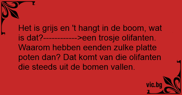 Het is grijs en 't hangt in de boom, wat is dat?------------>een trosje olifanten. Waarom hebben eenden zulke platte poten dan? Dat komt van die olifanten die steeds uit de bomen vallen.