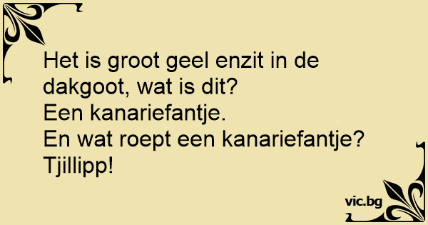 Het is groot geel enzit in de dakgoot, wat is dit?<br />Een kanariefantje.<br />En wat roept een kanariefantje?<br />Tjillipp!