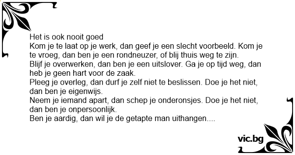 Kom je te laat op je werk, dan geef je een slecht voorbeeld. Kom je te vroeg, dan ben je een rondneuzer, of blij thuis weg te zijn.