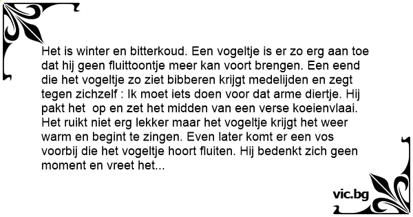 Het is winter en bitterkoud. Een vogeltje is er zo erg aan toe dat hij geen fluittoontje meer kan voort brengen. Een eend die het vogeltje zo ziet bibberen krijgt medelijden en zegt tegen zichzelf : Ik moet iets doen voor dat arme diertje. Hij pakt het op en zet het midden van een verse koeienvlaai. Het ruikt niet erg lekker maar het vogeltje krijgt het weer warm en begint te zingen. Even later komt er een vos voorbij die het vogeltje hoort fluiten. Hij bedenkt zich geen moment en vreet het diertje op met huid en veertjes.