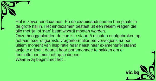 Het is zover: eindexamen. En de examinandi nemen hun plaats in de grote hal in. Het eindexamen bestaat uit een resem vragen die alle met ja of nee beantwoordt moeten worden.