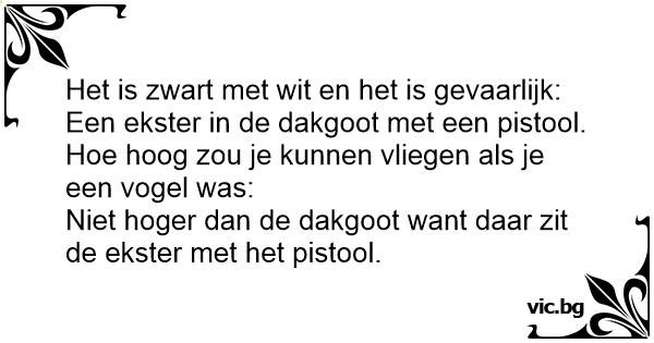 Niet hoger dan de dakgoot want daar zit de ekster met het pistool.