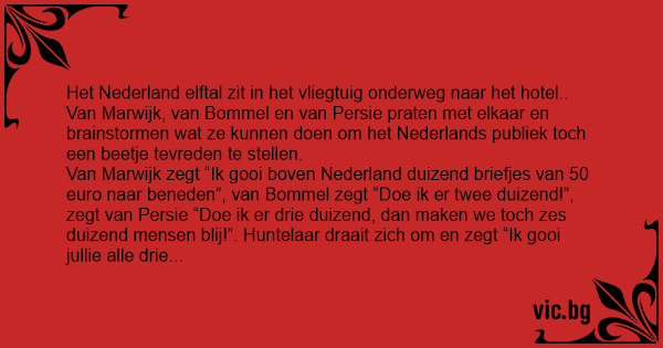 Van Marwijk zegt “Ik gooi boven Nederland duizend briefjes van 50 euro naar beneden”, van Bommel zegt “Doe ik er twee duizend!”, zegt van Persie “Doe ik er drie duizend, dan maken we toch zes duizend mensen blij!”. Huntelaar draait zich om en zegt “Ik gooi jullie alle drie naar beneden en dan maak ik 16 miljoen mensen blij!”