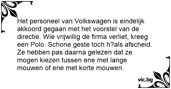 Het personeel van Volkswagen is eindelijk akkoord gegaan met het voorstel van de directie. Wie vrijwillig de firma verliet, kreeg een Polo. Schone geste toch h?als afscheid. Ze hebben pas daarna gelezen dat ze mogen kiezen tussen ene met lange mouwen of ene met korte mouwen.
