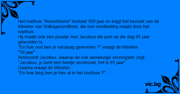 "Fantastisch" antwoordt Jacobus. "Voor mijn verjaardag heeft de verzorgster mijn pijp gepikt !!!!"