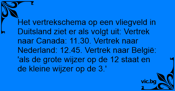 Het vertrekschema op een vliegveld in Duitsland ziet er als volgt uit: Vertrek naar Canada: 11.30. Vertrek naar Nederland: 12.45. Vertrek naar België: