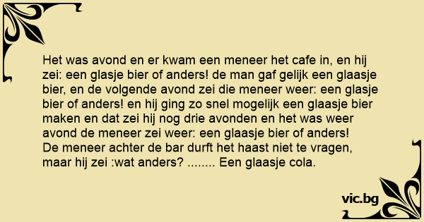 Het was avond en er kwam een meneer het cafe in, en hij zei: een glasje bier of anders! de man gaf gelijk een glaasje bier, en de volgende avond zei die meneer weer: een glasje bier of anders! en hij ging zo snel mogelijk een glaasje bier maken en dat zei hij nog drie avonden en het was weer avond de meneer zei weer: een glaasje bier of anders!