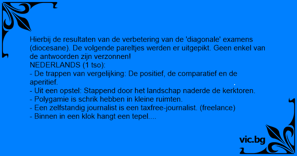 Hierbij de resultaten van de verbetering van de 'diagonale' examens (diocesane). De volgende pareltjes werden er uitgepikt. Geen enkel van de antwoorden zijn verzonnen!