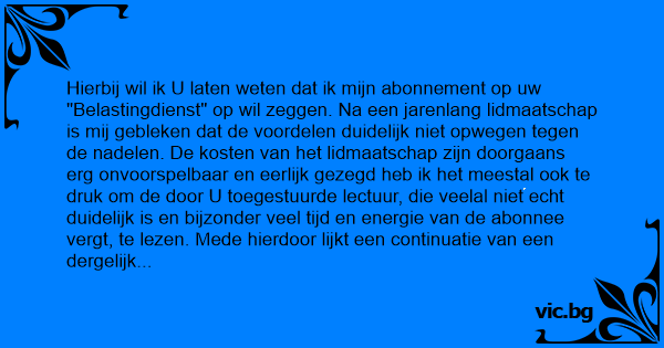 Hierbij wil ik U laten weten dat ik mijn abonnement op uw "Belastingdienst" op wil zeggen. Na een jarenlang lidmaatschap is mij gebleken dat de voordelen duidelijk niet opwegen tegen de nadelen. De kosten van het lidmaatschap zijn doorgaans erg onvoorspelbaar en eerlijk gezegd heb ik het meestal ook te druk om de door U toegestuurde lectuur, die veelal niet echt duidelijk is en bijzonder veel tijd en energie van de abonnee vergt, te lezen. Mede hierdoor lijkt een continuatie van een dergelijk abonnement in deze toch al dure tijden voor mij eigenlijk ook niet langer zinnig. Hierbij verzoek ik U dan ook vriendelijk mijn gegevens per direct uit Uw bestanden te verwijderen en mij niet langer te vervelen met uw duidelijk herkenbare enveloppen. Eventueel toch nog toegestuurde facturen voor de periode na